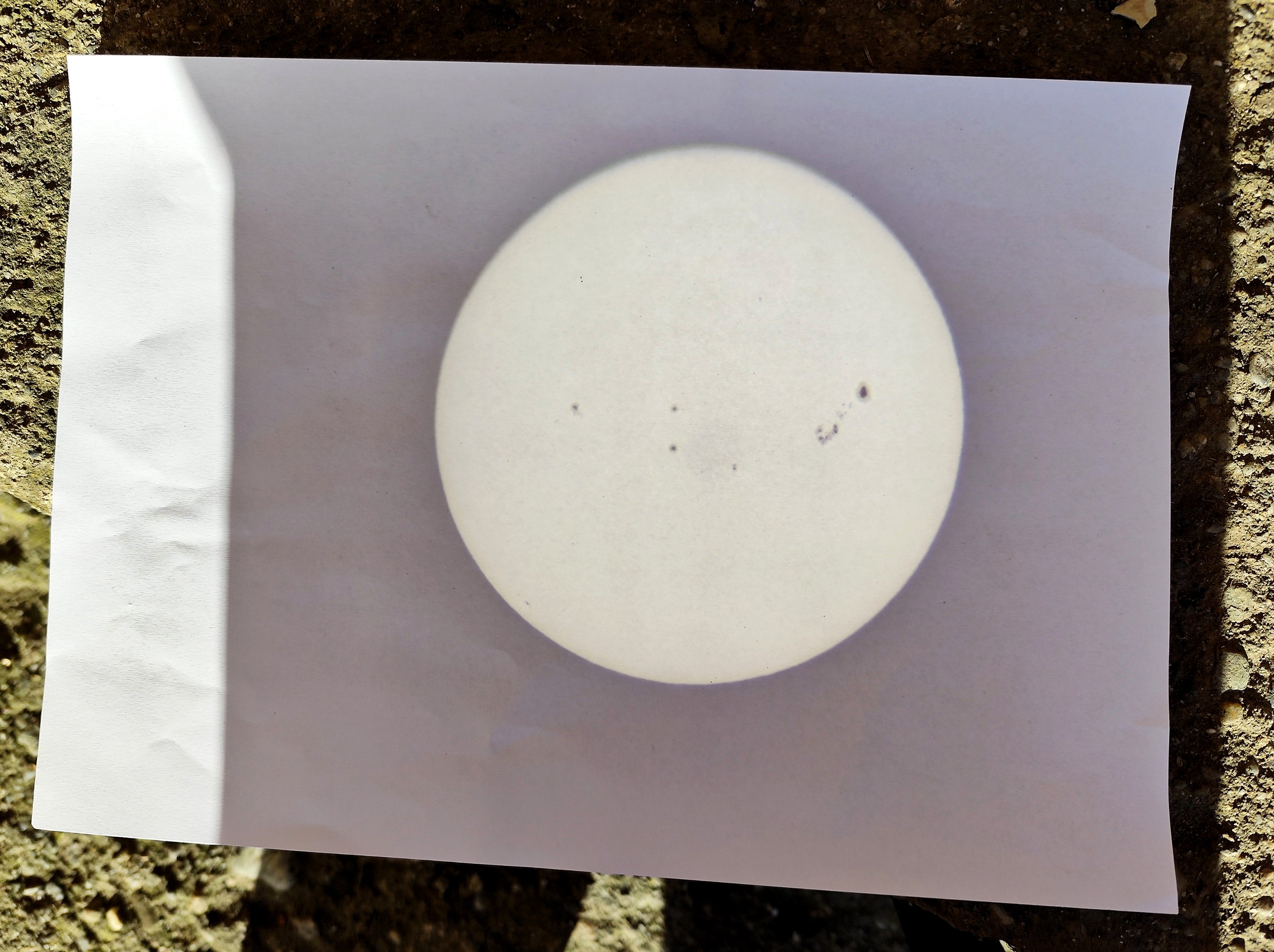 Azi, Joi 5 Februarie a.c., la ora 10:30 TLR / 8:30 UTC, am reusit sa vad, cu ochiul liber, un grup de doua pete solare. Pata vestica se vedea de doua ori mai mare ca cea estica si avea culoare neagra intensa. Cea estica, mai mica asa cum am aratat, era de o culoare gri inchis dar si avea marginile neclare, cetoase. Pata estica se vedea cam la R/8 de cea vestica. Fata de orizontala trecand prin pata vestica, as zice ca era cu un diametru al acesteia mai jos.