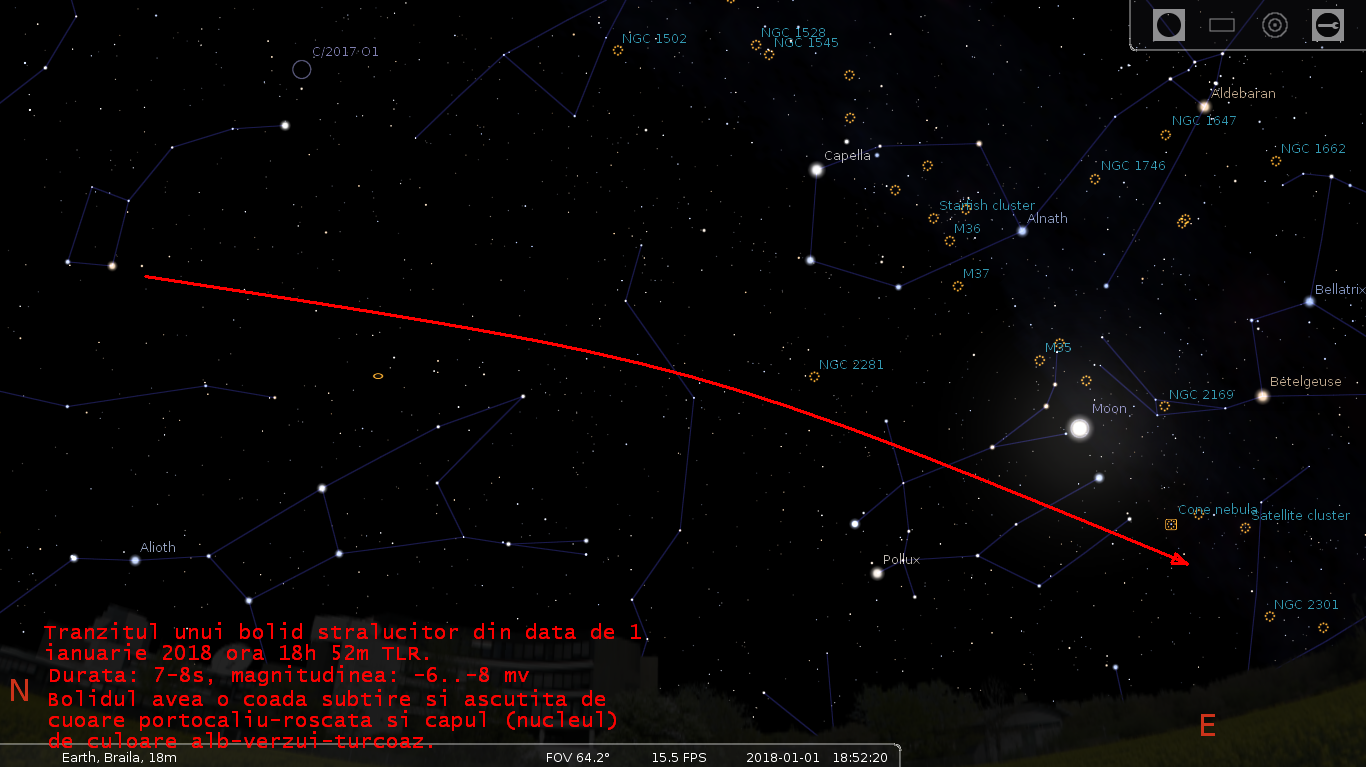 Aseara, in timp ce fotografiam Luna, pe la ora 18h 52m am zarit un bolid (meteor) foarte stralucitor, cum nu am mai vazut de cand ma ocup cu astronomia . A trecut dinspre nord spre est, prin constelatiile Ursa Minor, Ursa Major, Lynxul si pana in Gemeni, unde s-a stins. Traiectoria sa a fost destul de lunga, masurand peste 80 grade, iar durata a fost de 7-8 secunde, avand o viteza medie, nu a fost nici rapid , dar nici prea lent. Bolidul a avut o coada subtire si alungita, ascutita, de culoare portocalie-roscata, in timp ce capul bolidului a avut o culoare alb-verzui-turcoaz, mult mai stralucitor decat coada.