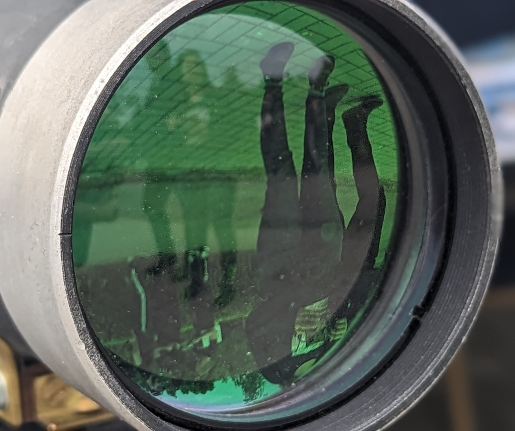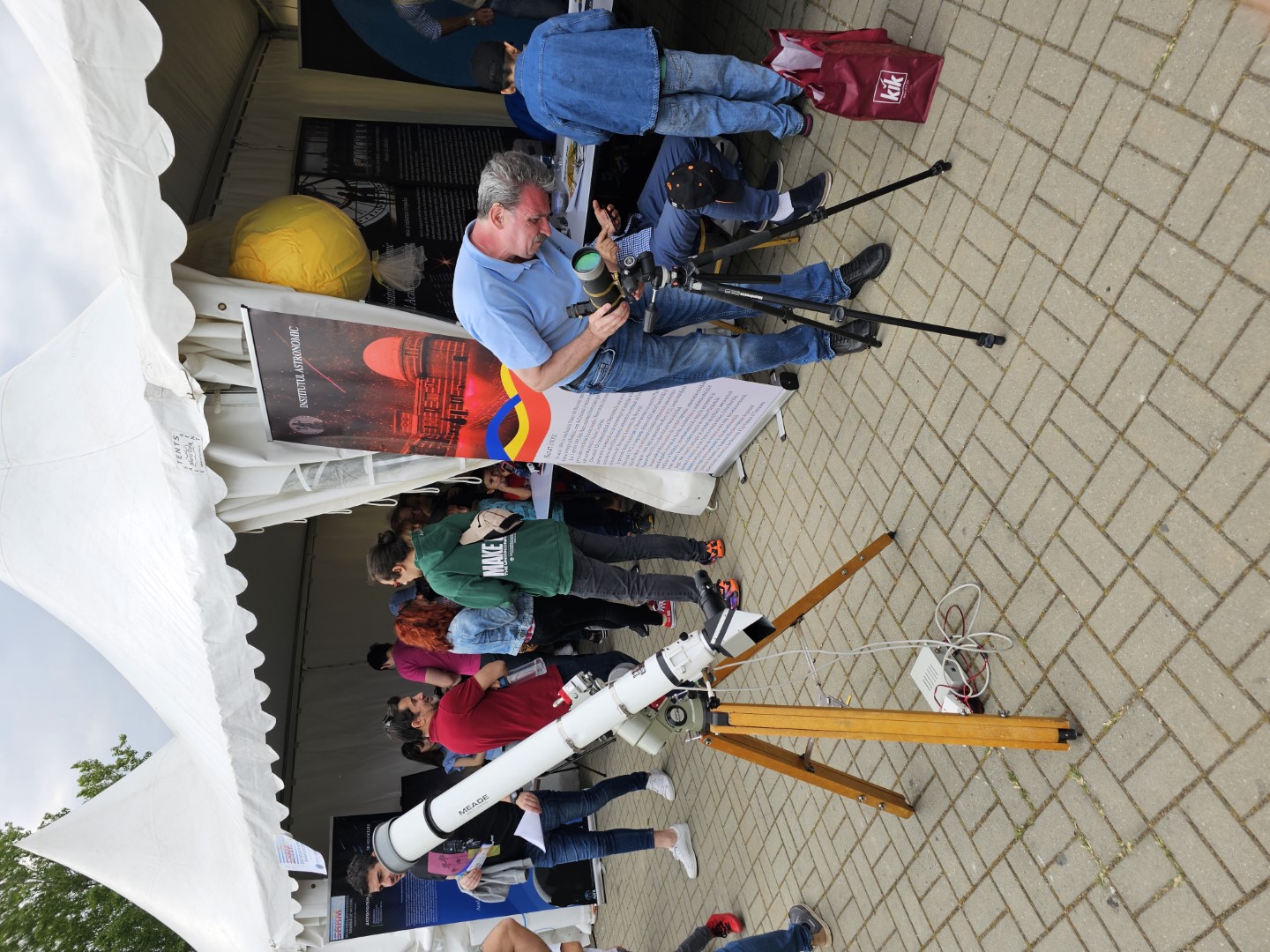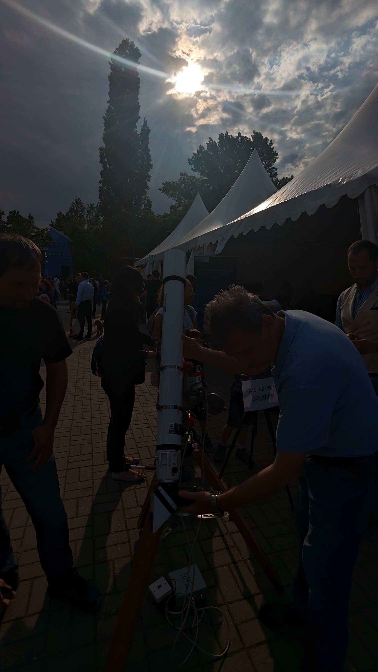 Luneta albă este Meade 90/1000mm și îi mulțumesc încă odată lui Sorini care mi-a împrumutat o prismă Herschel, ca și anul trecut, fabricată de Silviu/Zoth. Am cumpărat luneta din bazar, destul de ieftin, special pentru Soare și popularizare dar nu intră în focus cu prisma Herschel de la Institut. Montura este Vixen GP, motorizată cu onStep. De data asta am alimentat-o dintr-o baterie Li-Ion de 20V/2Ah de la Lidl care a ținut eroic mai mult de 6h deși era parțial descărcată. Spre seară la Venus și Castor am dat la "manivelă".