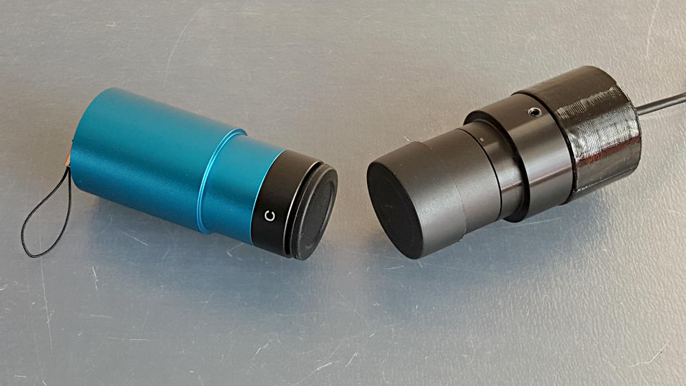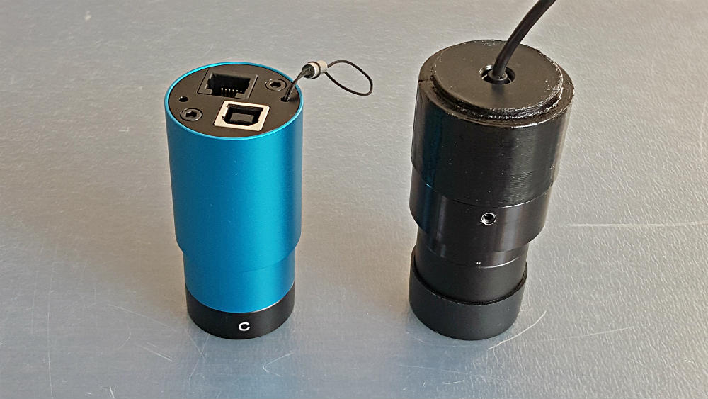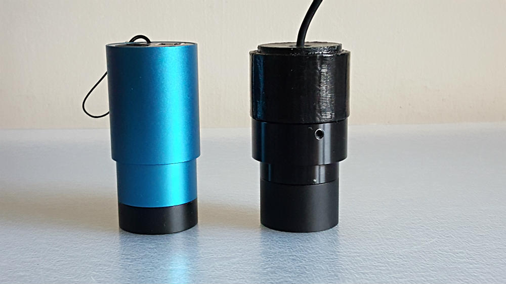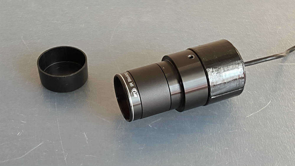 Webcamul este un MS Lifecam Cinema HD, cu senzor OV9712, de la care am pastrat doar "miezul", adica montajul cu senzor, carcasa si cablu, pe care l-am montat apoi intr-un barrel (nas, picior, cum vreti) de ocular pe 1.25"; apoi barrelul l-am fixat intr-o cupla (mufa, iesire..) de 1.25" de la un filtru polarizor care oricum era prea scurta, dar aici s-a potrivit la fix; dupa care i-am conectat o extensie de 1.25" cu filet M28 la un capat, iar la capatul unde ramasese barrelul liber am imbracat-o cu doua semi-carapace printate 3D; la final i-am adaugat filtrul IR-cut pentru a taia glare-ul specific in infrarosul apropiat. Nu in ultimul rand, i-am inecat LED-ul albastru extrem de suparator in niste oja neagra
