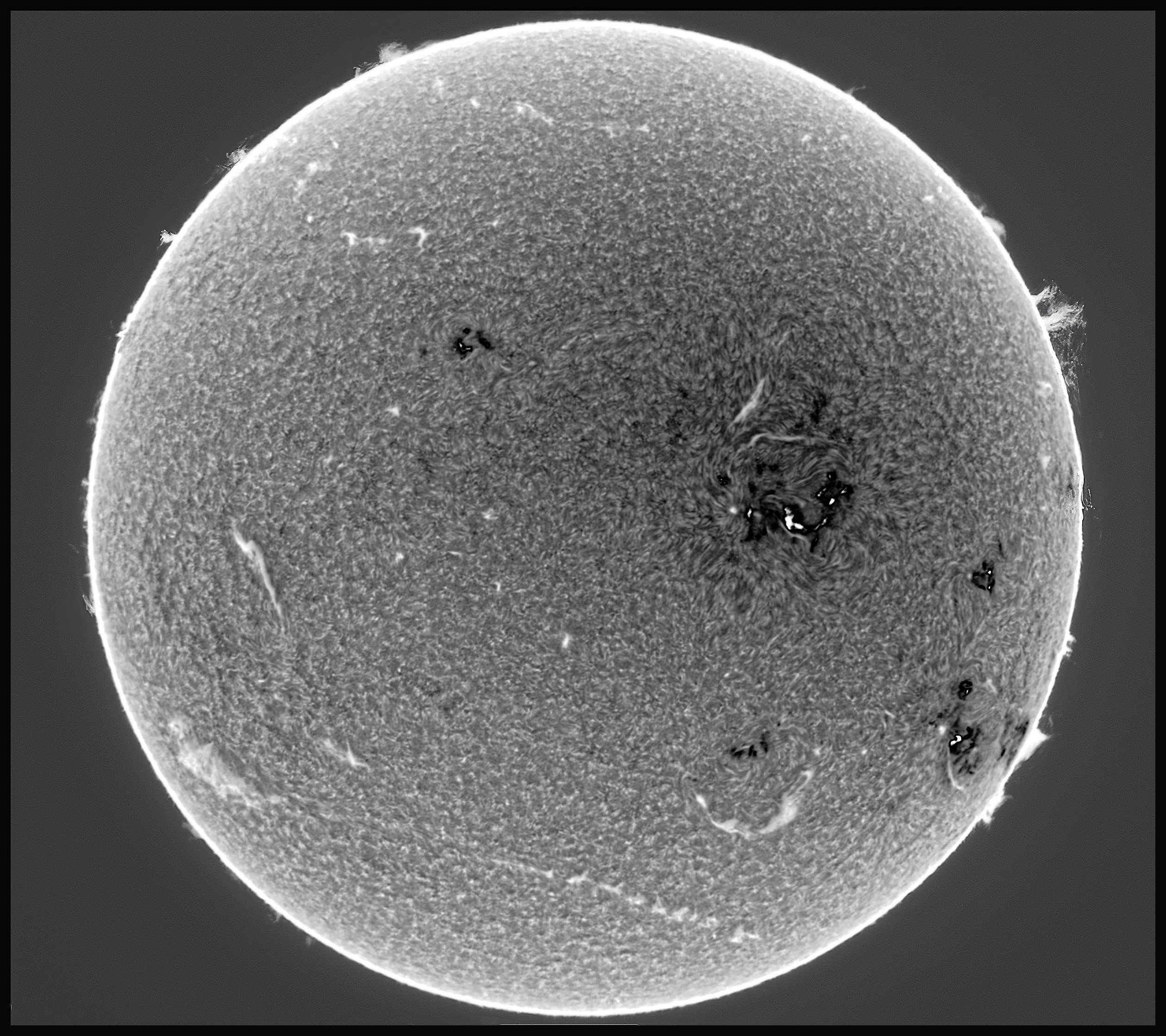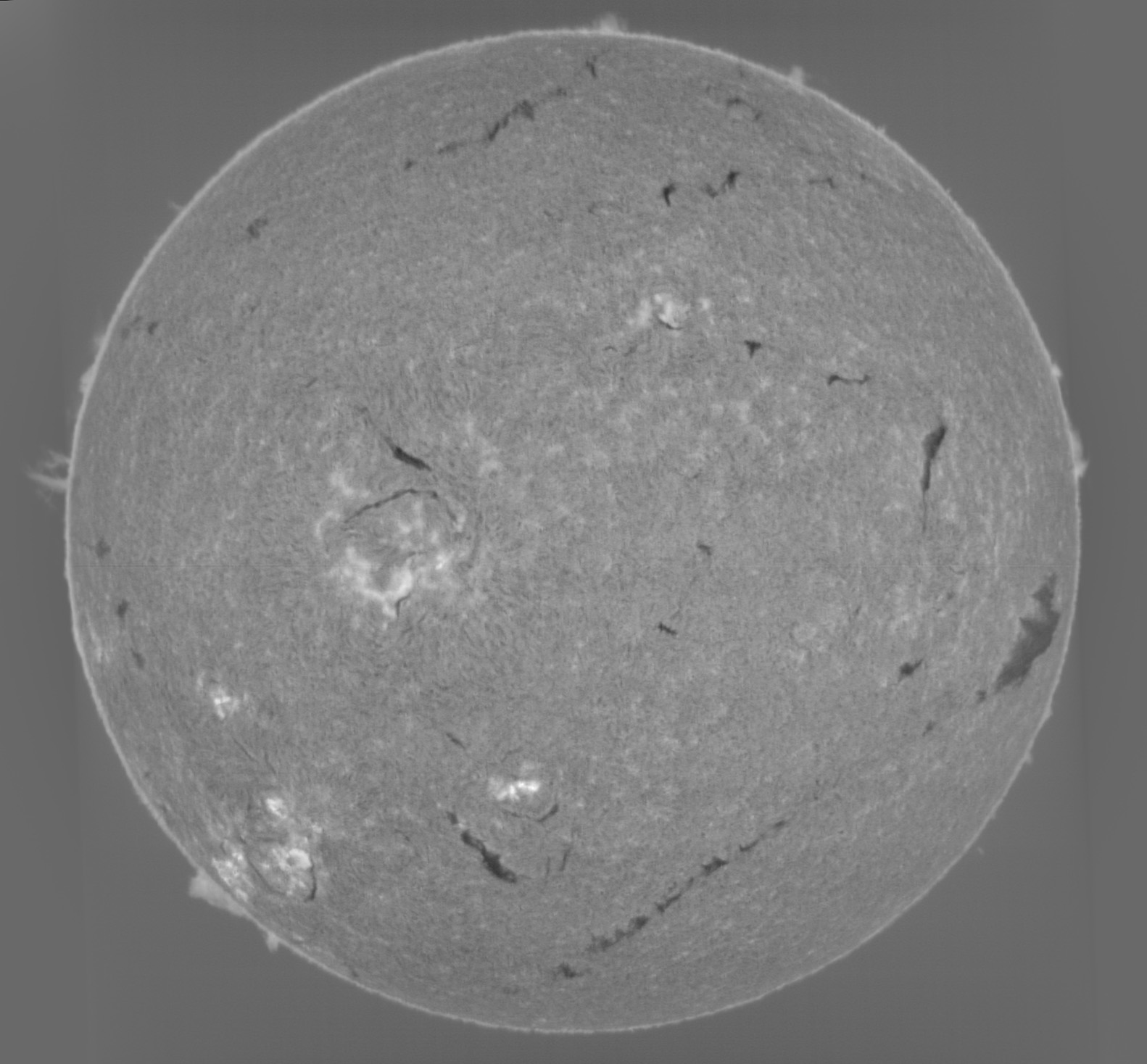 Dupa o saptamana de pauza, astazi dupa amiaza am iesit si eu la fotografiat Soarele in banda ingusta, cu spectroheliograful de 60mm, insa transparenta a lasat de dorit, cerul fiind acoperit cu nori Cirrusi fini, care au deenit mai tarziu mai opaci slabind lumina solara dar mai ales contrastul imaginii discului solar. Totusi ,seeing-ul a fost bun, obtinand claritate buna in unele scanari (pe altele vantul le-a mai afectat).