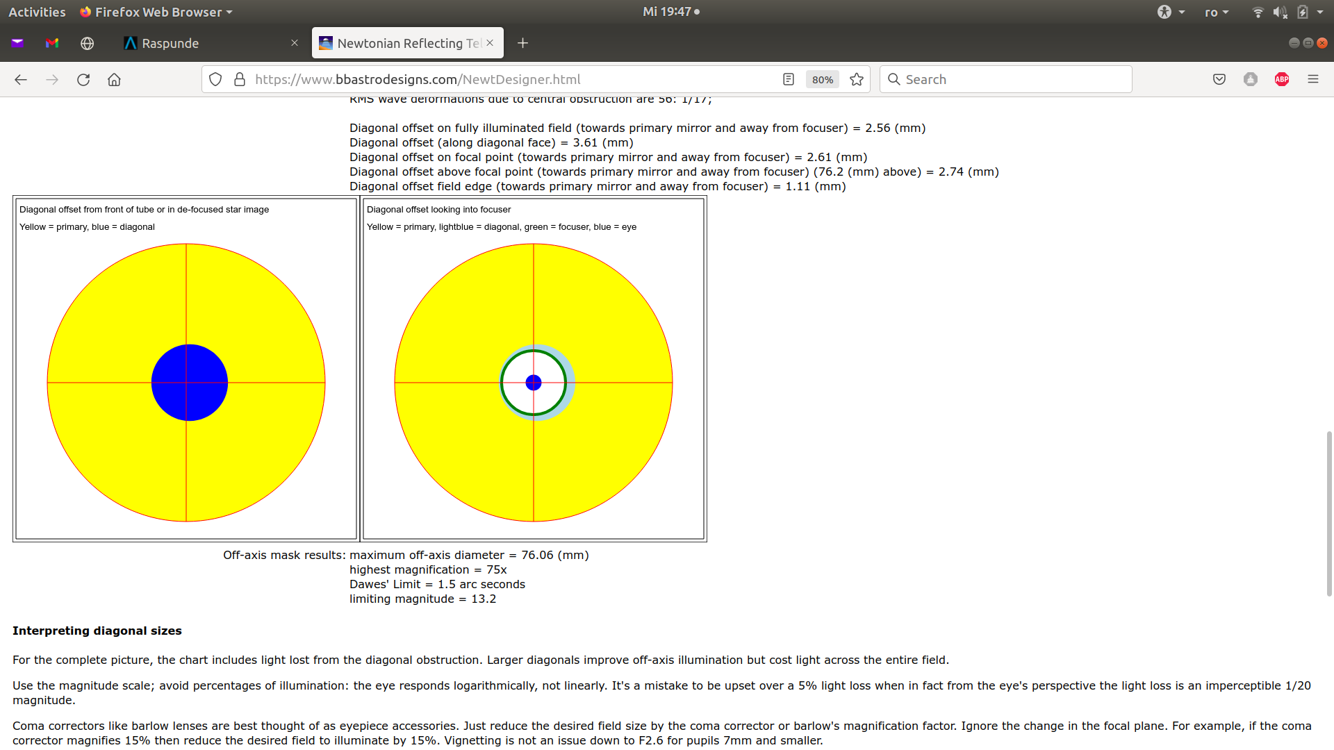 Pe site-ul lui Mel Bartels există calculator online pentru optimizarea câmpului de plină lumină, l-am folosit la telescopul mic și a ieșit ceva neașteptat de bun. La tubul existent am niște limitări, cum am mai spus, de buget, din cauza asta vreau să păstrez cât mai multe componente, inclusiv focuserul. O să-i fac o altă bucșă de 2" care să rămână în tubul port-ocular, acum este o extensie în afară. Asta îmi permite să reduc cu 30mm distanța dintre secundară și ocular, o pot îndepărta puțin de primară, ceea ce se traduce într-o micșorare corespunzătoare a obstrucției. O să fac măsurătorile necesare și să văd ce zice calculatorul câmpului de plină lumină.