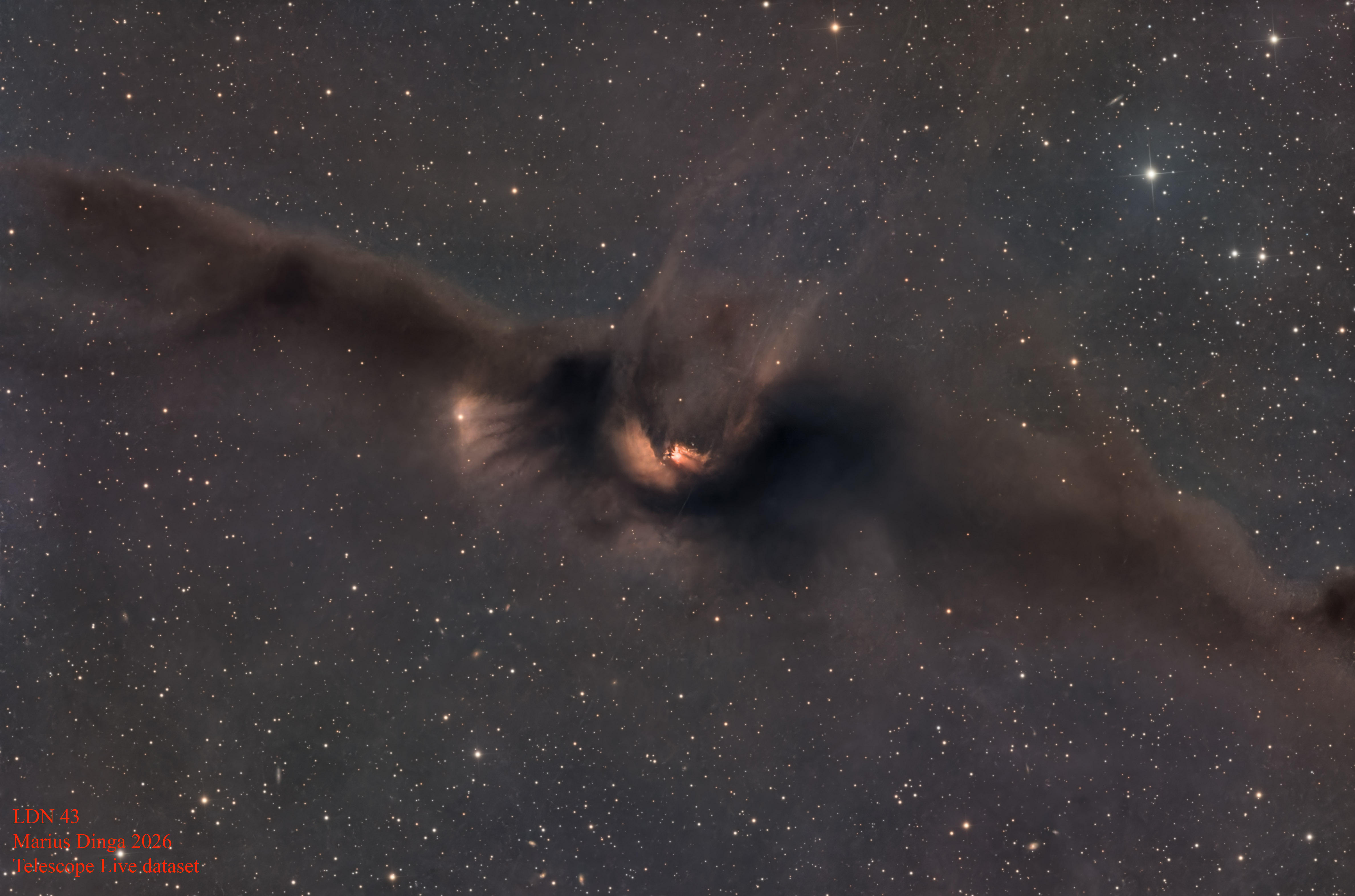 LDN 43, sau Nebuloasa Liliacul Cosmic, este o nebuloasa intunecata din constelatia Ophiuchus, cunoscuta pentru forma sa distinctiva asemanatoare unui liliac, formata din nori densi de praf care blocheaza lumina stelara din fundal, transformand-o intr-o pepiniera stelara unde se formeaza stele noi, cu noduri stralucitoare de gaz (nebuloase cometare) vizibile in interior.