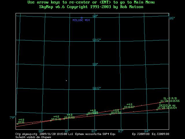 | mak a scris: | | As avea si o rugaminte: in timp ce observam M31, in jurul orei 18.15, mi-au intrat in campul ocularului doua obiecte, unul mai stralucitor, unul mai intunecat si mai mic, ce se miscau pe aceeasi traiectorie, la o distanta de aproximativ 1° unul de celalalt (doua diametre de Luna), dinspre sud catre nord, cam la un grad mai jos de galaxie. Stie cineva ce ar putea fi cele doua obiecte? Statia spatiala internationala nu cred ca e, din cate stiu nu bantuie prin zona aia. |