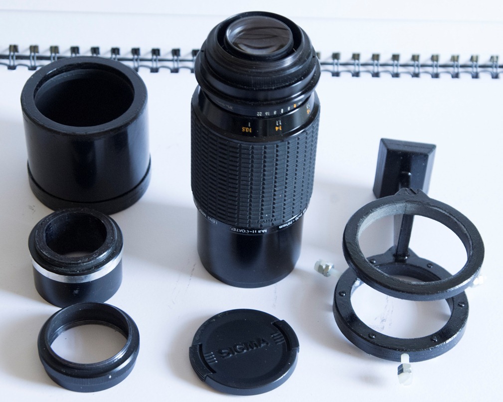 De aceea cu ajutorul unor tuburi macro M42, acest obiectiv, un Sigma 70-210mm F4,5 constant, a fost transformat intr-o luneta variabila, capabila sa primeasca oculare de 1,25''. Am utilizat-o atat cu un ocular SP de 10mm, cat si cu un Erfle de 17mm, si am fost multimit de rezultate. Marirea obtinuta cu un ocular de 10 este intre 7x si 21x, iar cu ocularul de 17 este intre 4,1x si 12,3x.