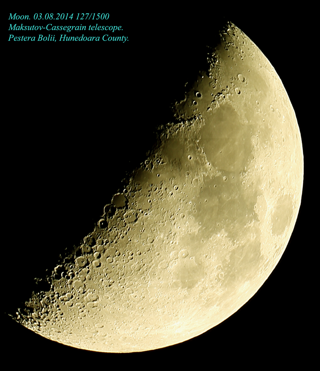 Surprinzator, un telescop mic - Skywatcher Mak 127mm OTAW - poate oferi privelisti superbe... ale lunii. Cand ii voi atasa un DSLR sau un CCD voi reveni cu informatii utile. Sfat: accesoriile telescopului (oglinda zenitala, ocular, filtre, camera) trebuie sa fie de calitate.