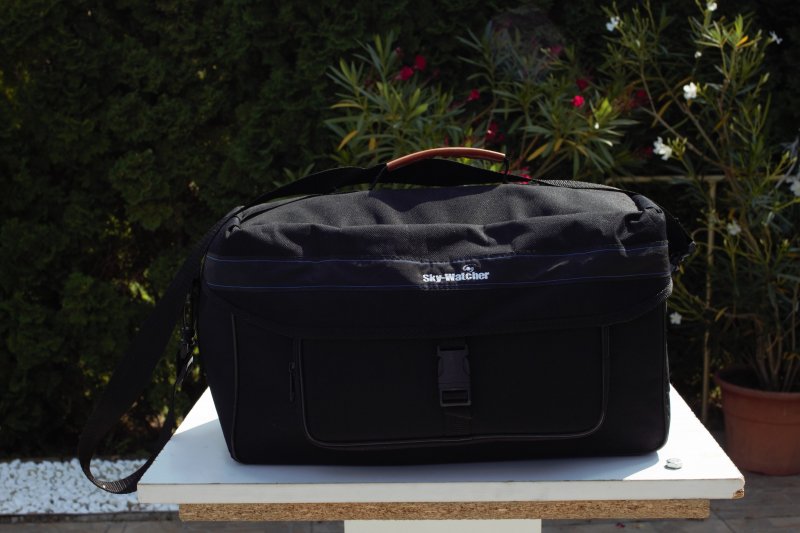 In pachet mai este inclusa geanta de transport Skywatcher...(n-am vazut sa "se muste" cu tubul care e Celestron...) si care este perfecta pentru C6 si de-asemeni sursa de alimentare 220/12V 2A.