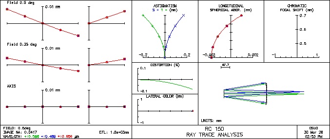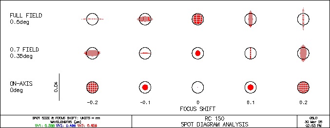 Cu valorile astea introduse in softul de analiza mi-a dat rezultatele din imaginile de mai jos, un telescop care intradevar nu dezvolta coma si este foarte bine corectat (supracorectia reziduala este foarte mica, total nesemnificativa). Totusi rezultatul fuge vertiginos daca distanta dintre oglinzi se modifica, trecand ori in subcorectie ori in supracorectie ..