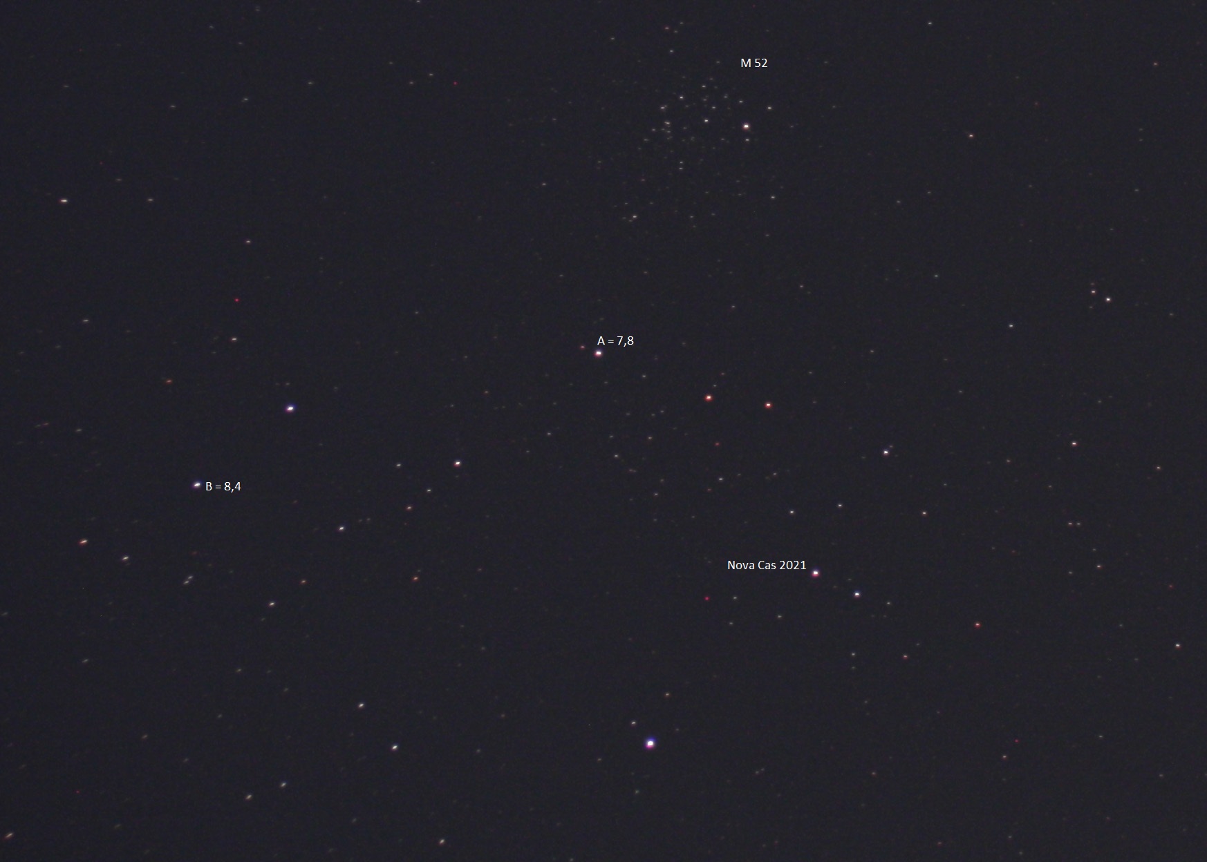 Aseara am mai obsevat nova Cas 2021, cu reflectorul de 11/900mm, la grosismentul de 45x, comparand-o cu aceleasi stele de 7,8 mag si 8,4 mag ,ca si in seara precedenta, rezultand formula A2V2B, iar rezultatul este 8,1 magnitudini pentru nova, deci a mai scazut foarte putin stralucirea sa, dar inca se mai observa relativ bine prin telescopul de 114mm.