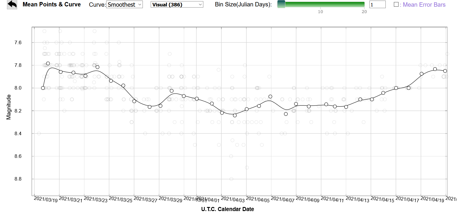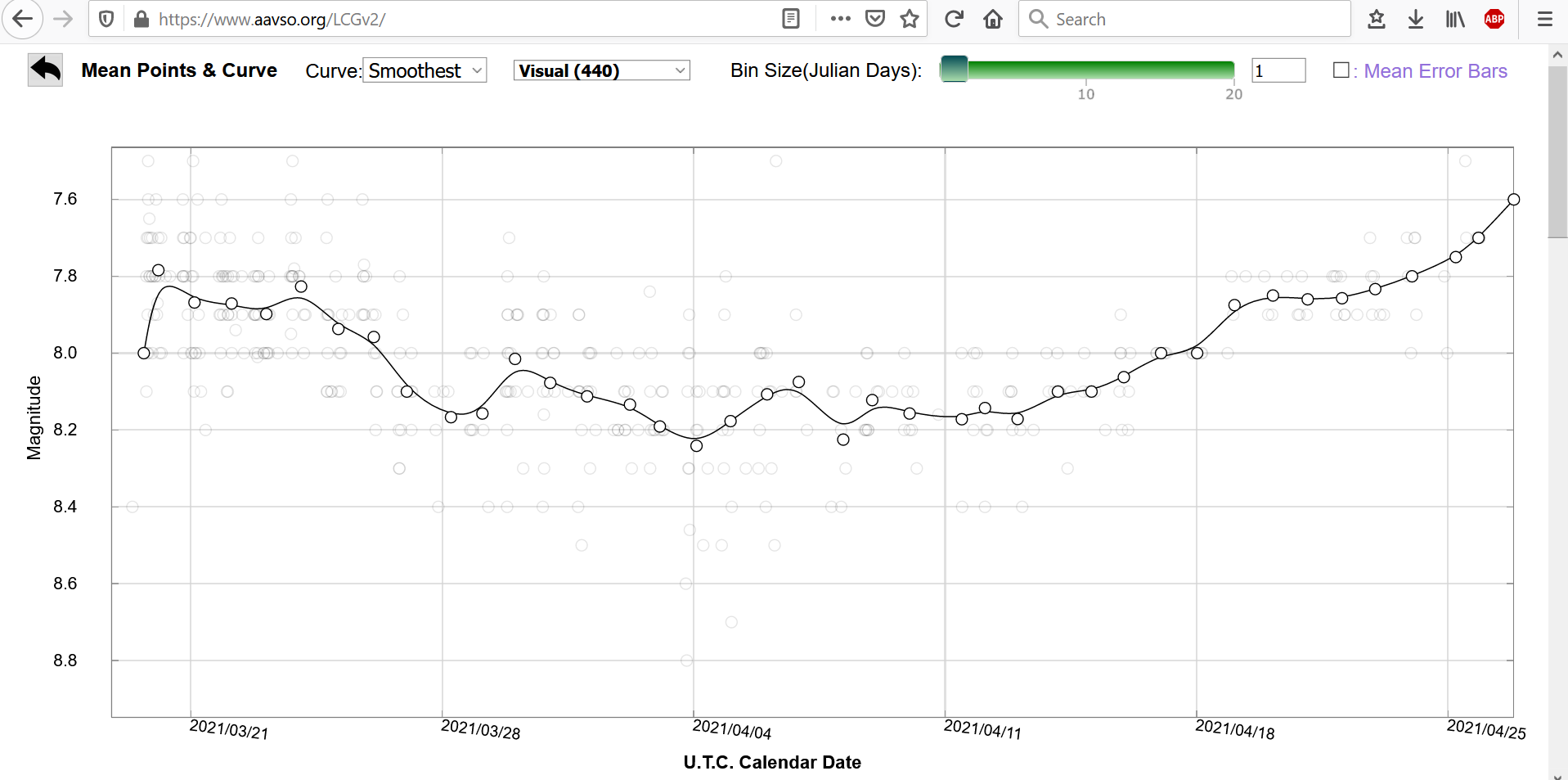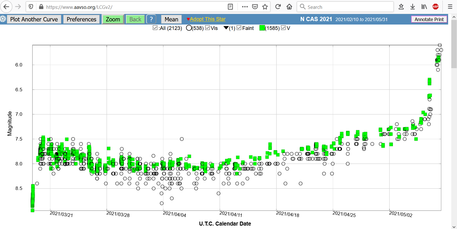 De vreo 3 zile, nova are o usoara tendinta de crestere in stralucire. Aseara am estimat-o la 8.0: Nova Cas 2021