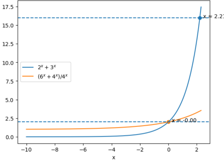 (2^x+3^x)/2^x=2 dar 2^x+3^x=16