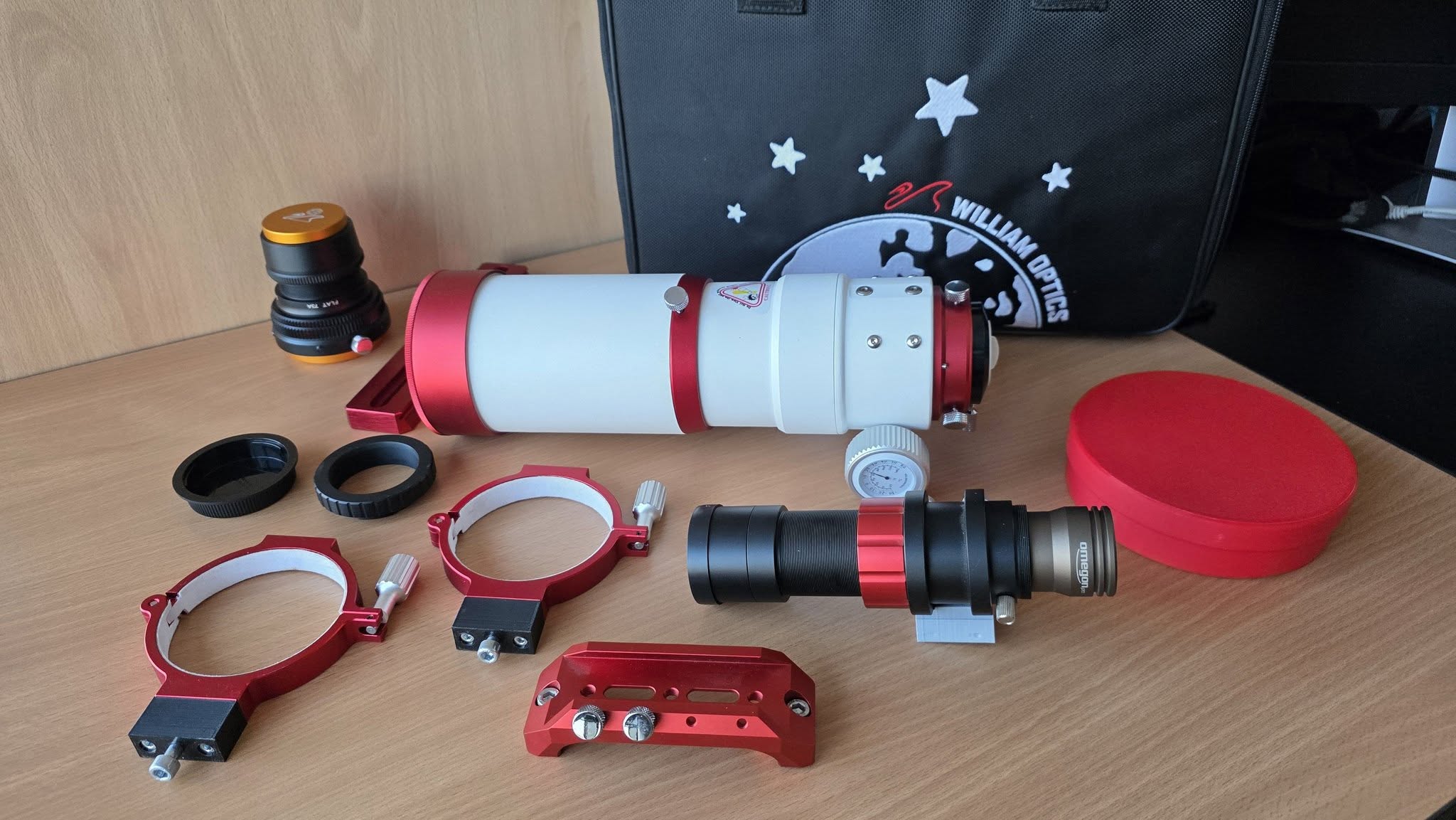 Set complet William Optics ZS73, flattener 73A, camera Omegon Guide 1200b C Color, luneta de ghidaj SV165 120mm, inel adaptor Canon si filtru solar.
