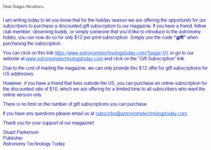 Pentru o perioada de timp, se pot face abonamente la revista Astronomy Technology Today la pretul de 10 dolari pentru un abonament de un an. Revista este online, sub forma de pdf-uri, varianta pe hartie fiind disponibila doar in USA.