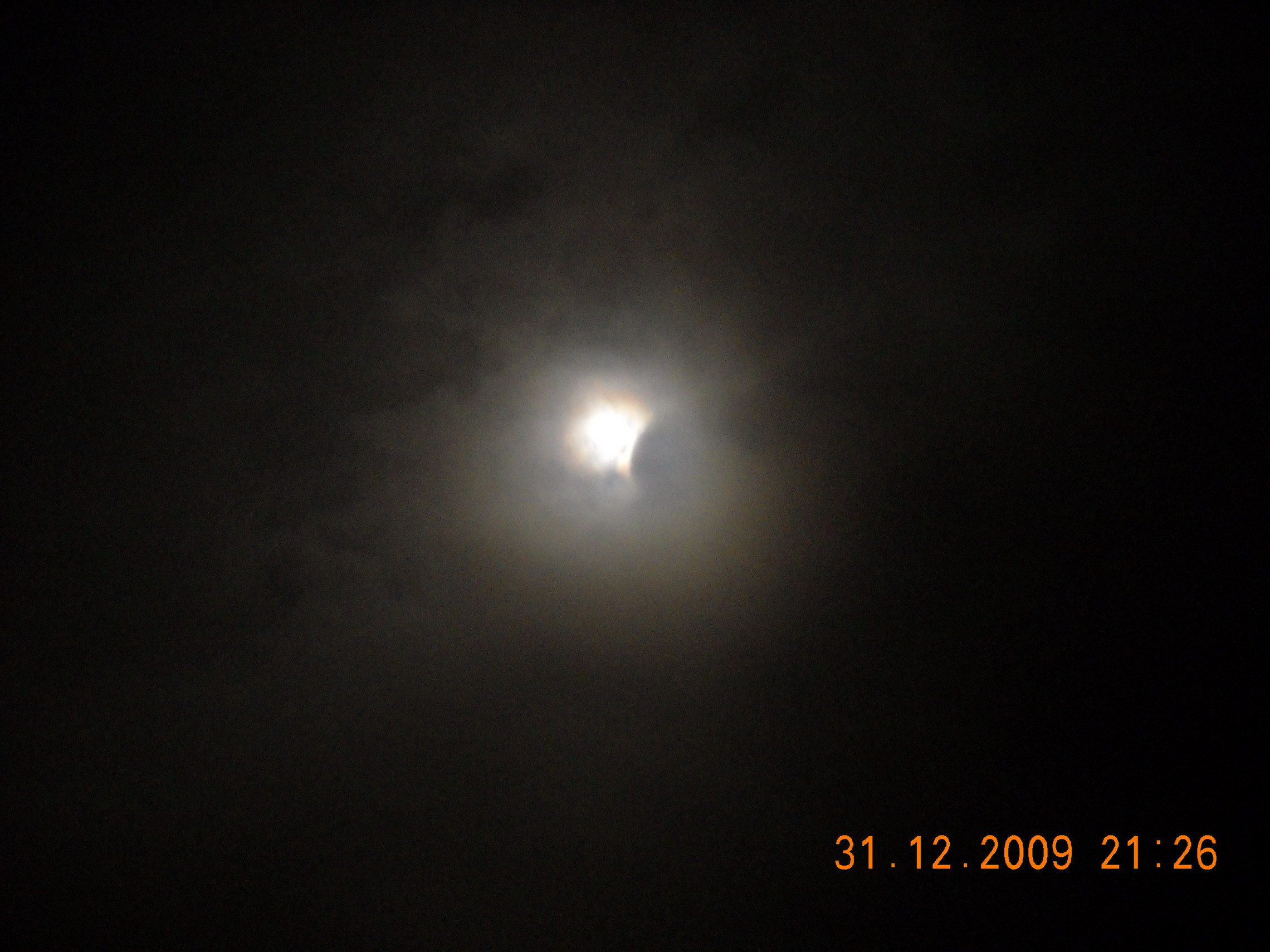 In ultima zi a anului 2009 am prins o eclipsa partiala de luna in zona Innsbruck, ora locala 20.25 . Chiar daca era putin innourat s-a putut observa.