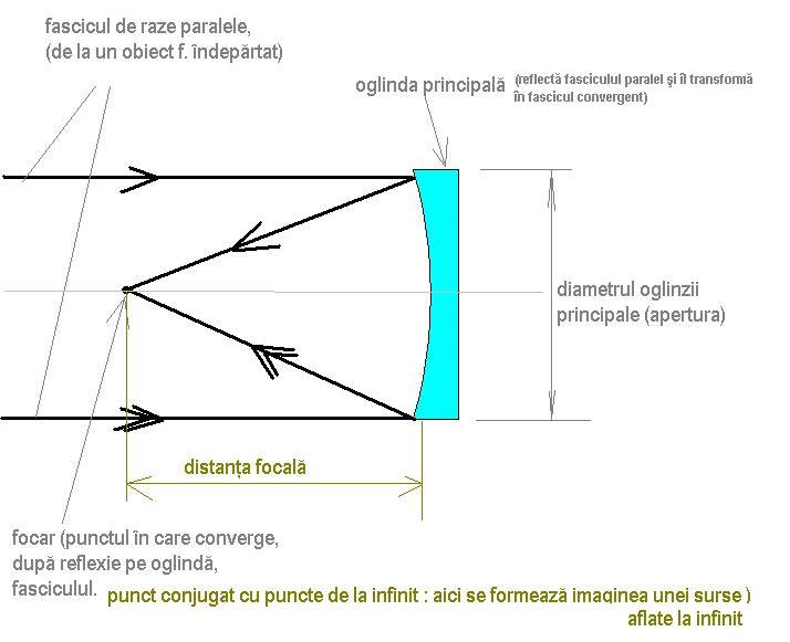 Oglinda telescopului transformă un fascicul paralel în fascicul convergent. Distanța focală este distanța, măsurată de la suprafața oglinzii, la care fasciculul de lumină devine un punct (focar).