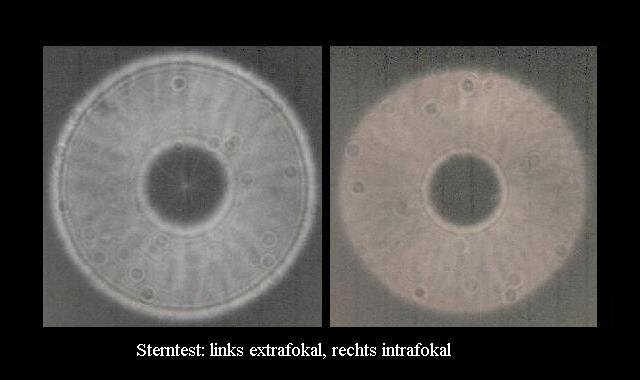 Cand ai gasit focusul defocisezi steaua intrafocal cu 1/2 de invartura la focus si te uiti la inelele care se fac, cand o stea este defocusata. Daca aceste inele luminoase sant concentrice si rotunde, atunci sistemul este inca bine colimat. Dupa asta intorci focuserul din nou pe steua si o focusezi, si o defocusezi inca o data dar extrafocal in aceas marime, cum ai defocusat-o intrafocal, adica tot 1/2 de invartura. Acum vezi inca o data niste inele luminoaze, dar si aici trebue sa le vezi fine si despartite intre ele. Forma trebue sa fie tot rotunda si inelele sa stea concentric.